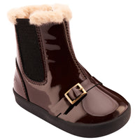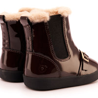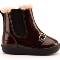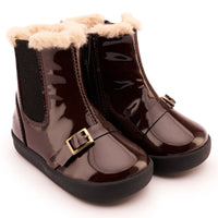 Brown patent leather. Elastic sides for a secure fit. A side zipper for easy on and off. Faux fur lining. An adorable buckle to add style.
